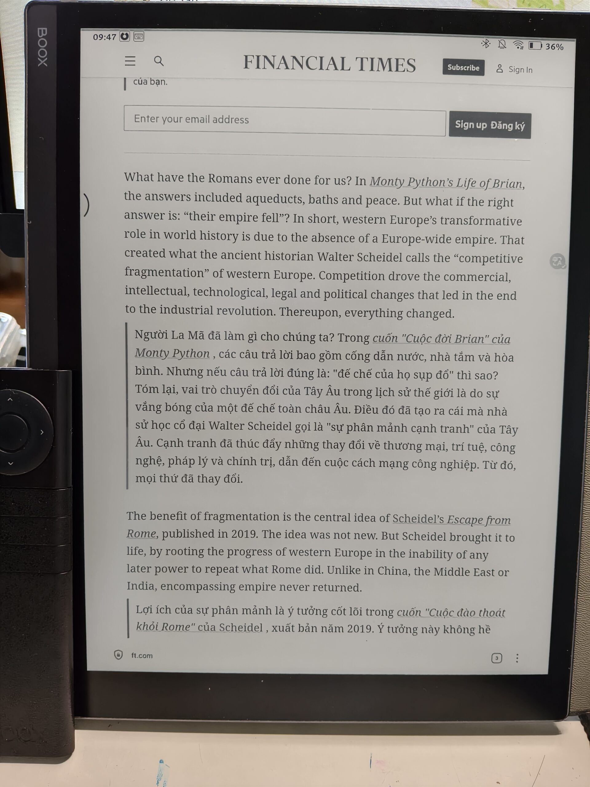 ft.com has many well-written articles. However, sometimes it’s hard to fully understand because the authors use quite a lot of uncommon words. Having translated content along side with the original text will be convenient. After searching around, I found the extension Immersive translate which works very well. I just use Google Translate so the free version is good enough for me. I can also customize how the translated content will be displayed. Very nice.
